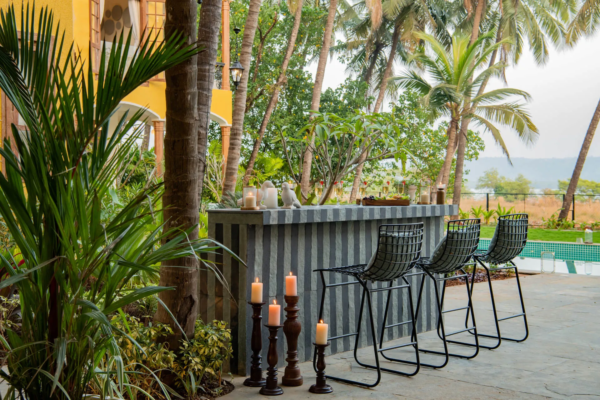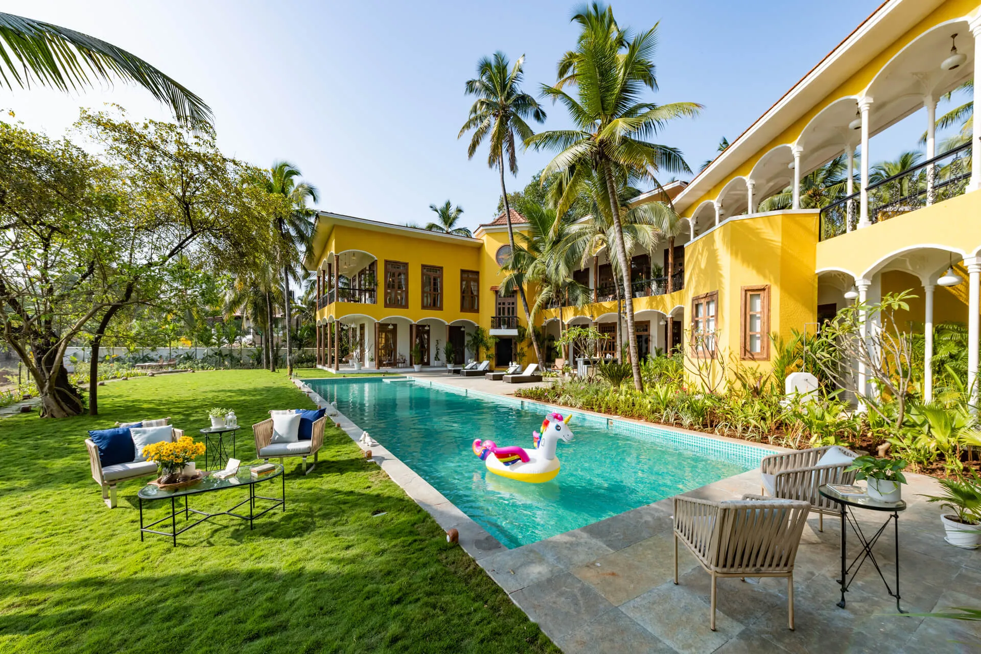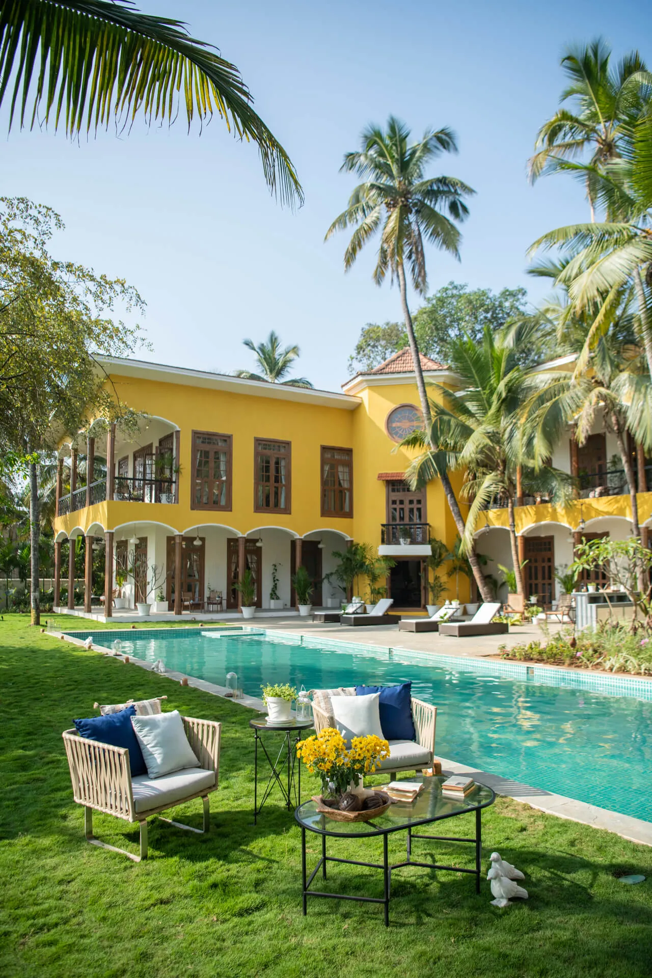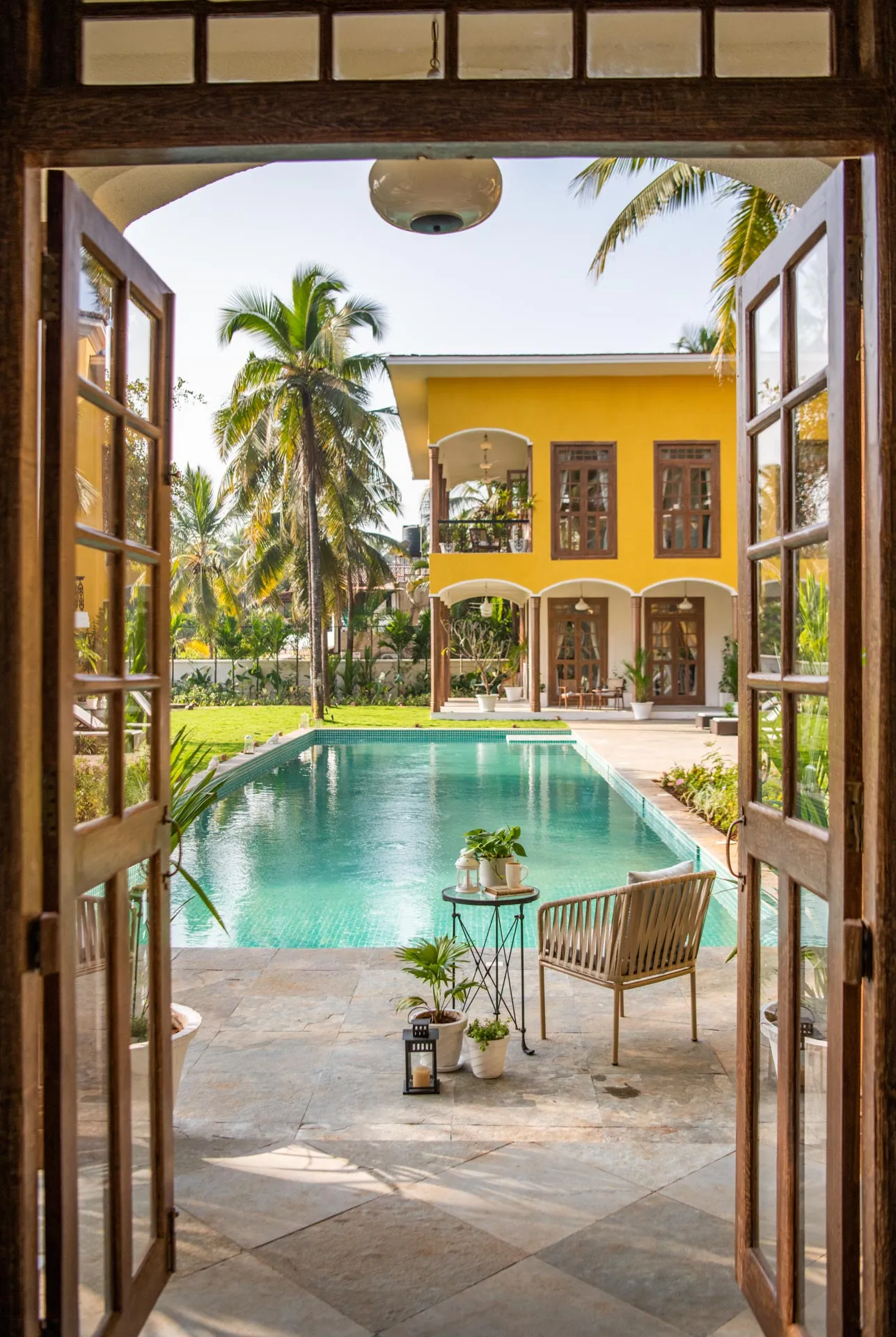 Welcome to lakehouse living in Goa. Estate De Alta Palmeira roughly translates to ‘tall palm trees estate’. Nestled amid swaying palms and overlooking Chapora River, the bright yellow villa is the quintessential spot for a fun-filled holiday. The main building has two levels and houses the living area, dining area, four bedrooms, and a Den. There’s also a two-storied Outhouse, which comprises a spa and one bedroom. The connecting passage contains a powder room and kitchen. Bask in the afternoon sun by the lawns or swim under the palm shadows in the open-air pool. Spend balmy evenings reading in the armchairs overlooking the river. The cosy interiors are a modern take on traditional Goan villas, while the patios are the perfect place to listen to birdsong and rustling leaves. Estate Alta De Palmeira’s thoughtful details, patterned floors and arched walkways are an invitation to slow days and long conversations over wine or a cocktail.