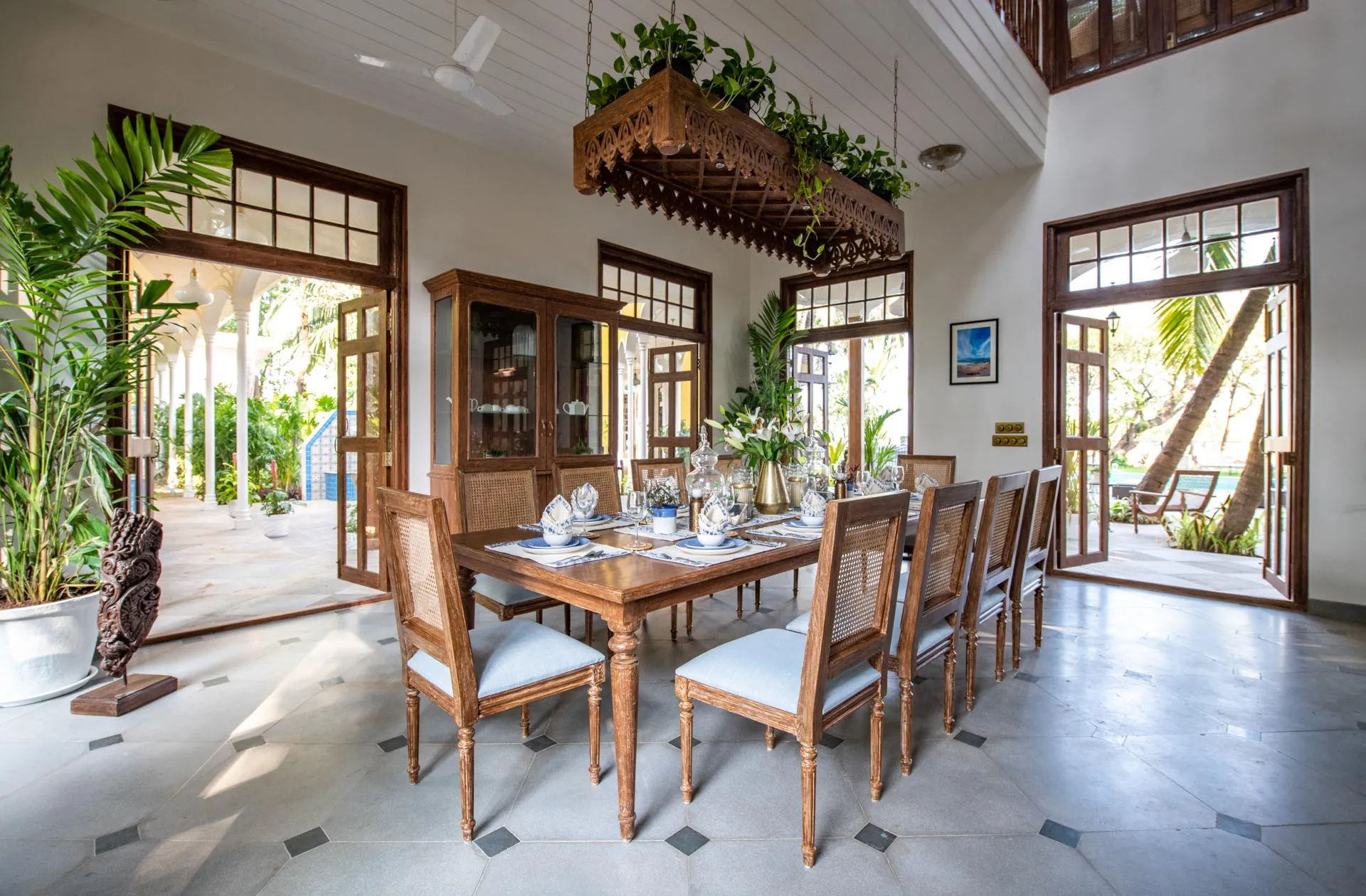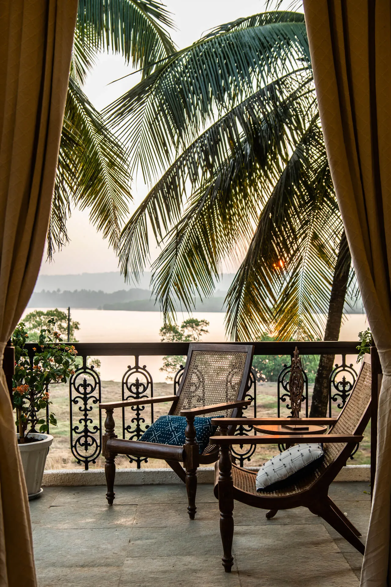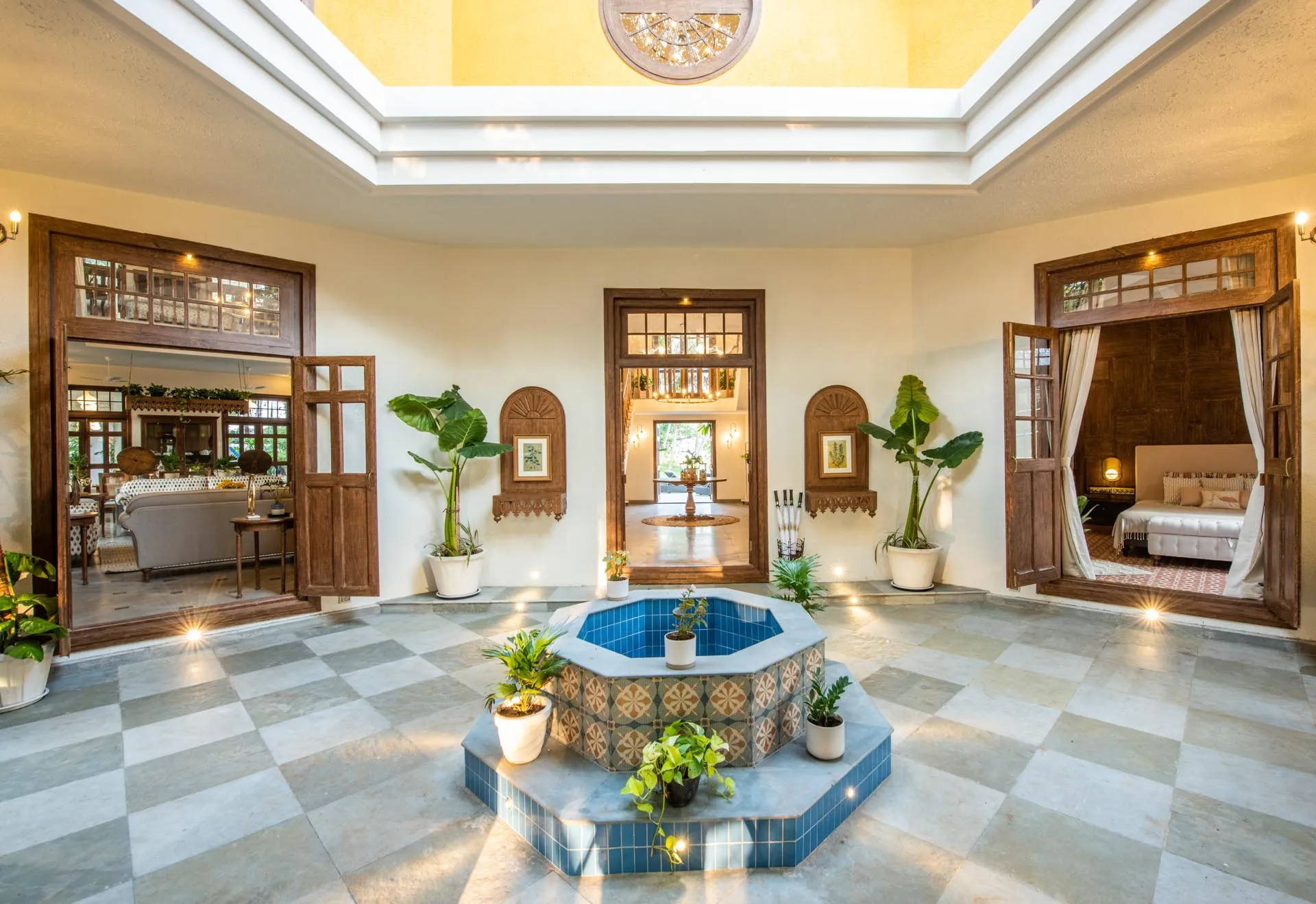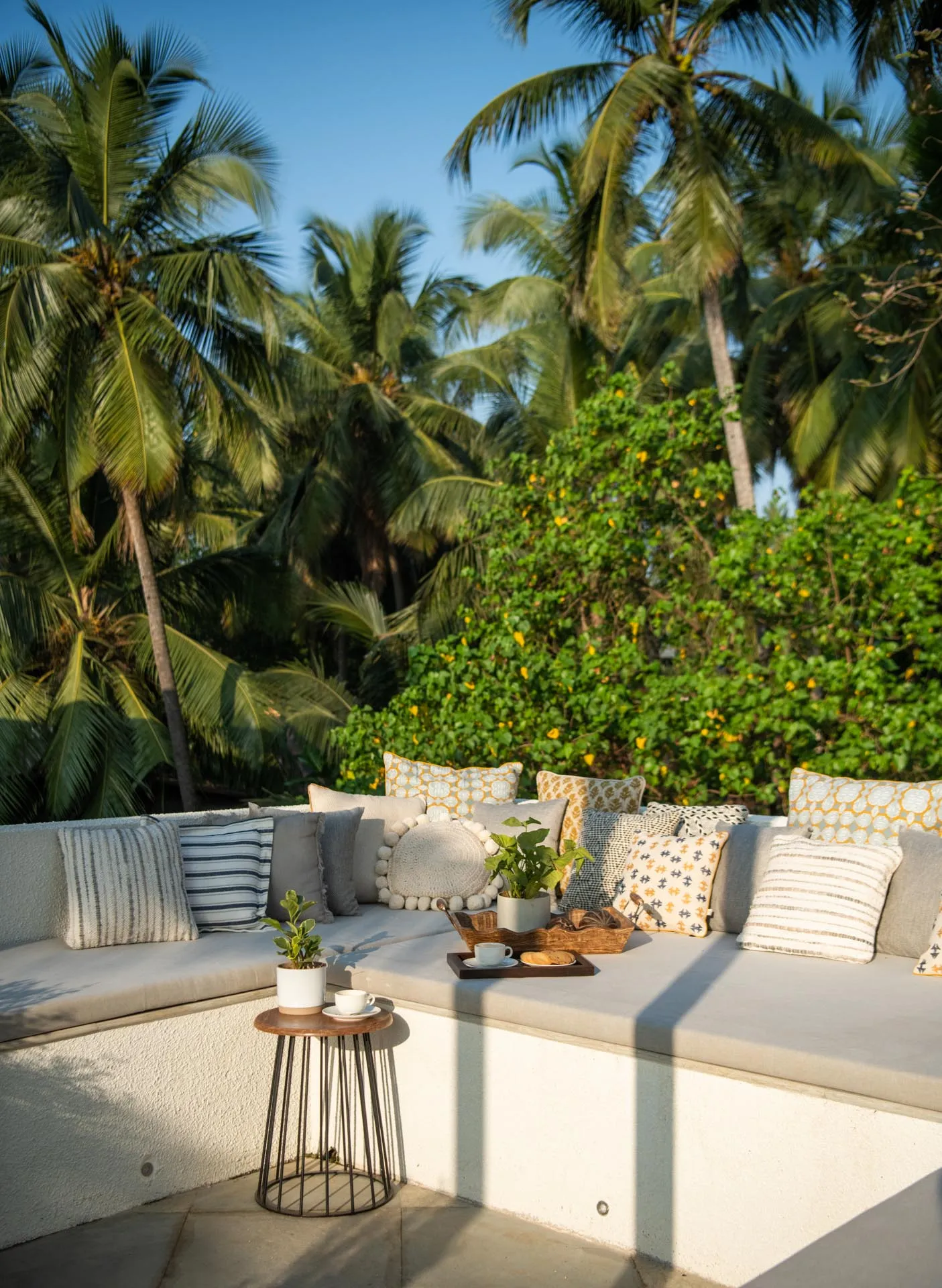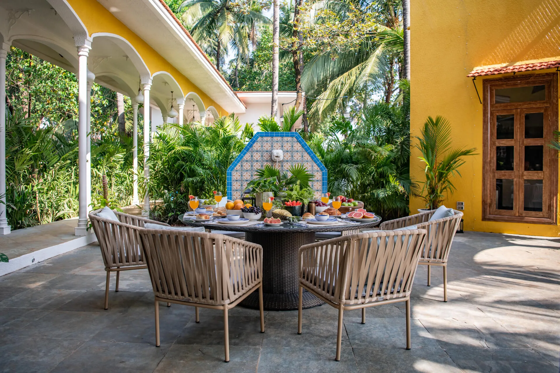 Welcome to lakehouse living in Goa. Estate De Alta Palmeira roughly translates to ‘tall palm trees estate’. Nestled amid swaying palms and overlooking Chapora River, the bright yellow villa is the quintessential spot for a fun-filled holiday. The main building has two levels and houses the living area, dining area, four bedrooms, and a Den. There’s also a two-storied Outhouse, which comprises a spa and one bedroom. The connecting passage contains a powder room and kitchen. Bask in the afternoon sun by the lawns or swim under the palm shadows in the open-air pool. Spend balmy evenings reading in the armchairs overlooking the river. The cosy interiors are a modern take on traditional Goan villas, while the patios are the perfect place to listen to birdsong and rustling leaves. Estate Alta De Palmeira’s thoughtful details, patterned floors and arched walkways are an invitation to slow days and long conversations over wine or a cocktail.