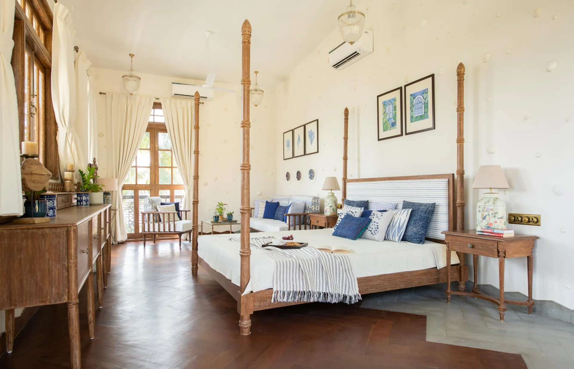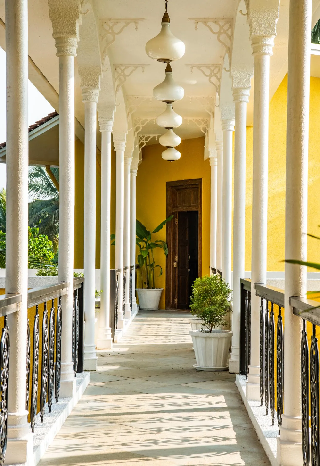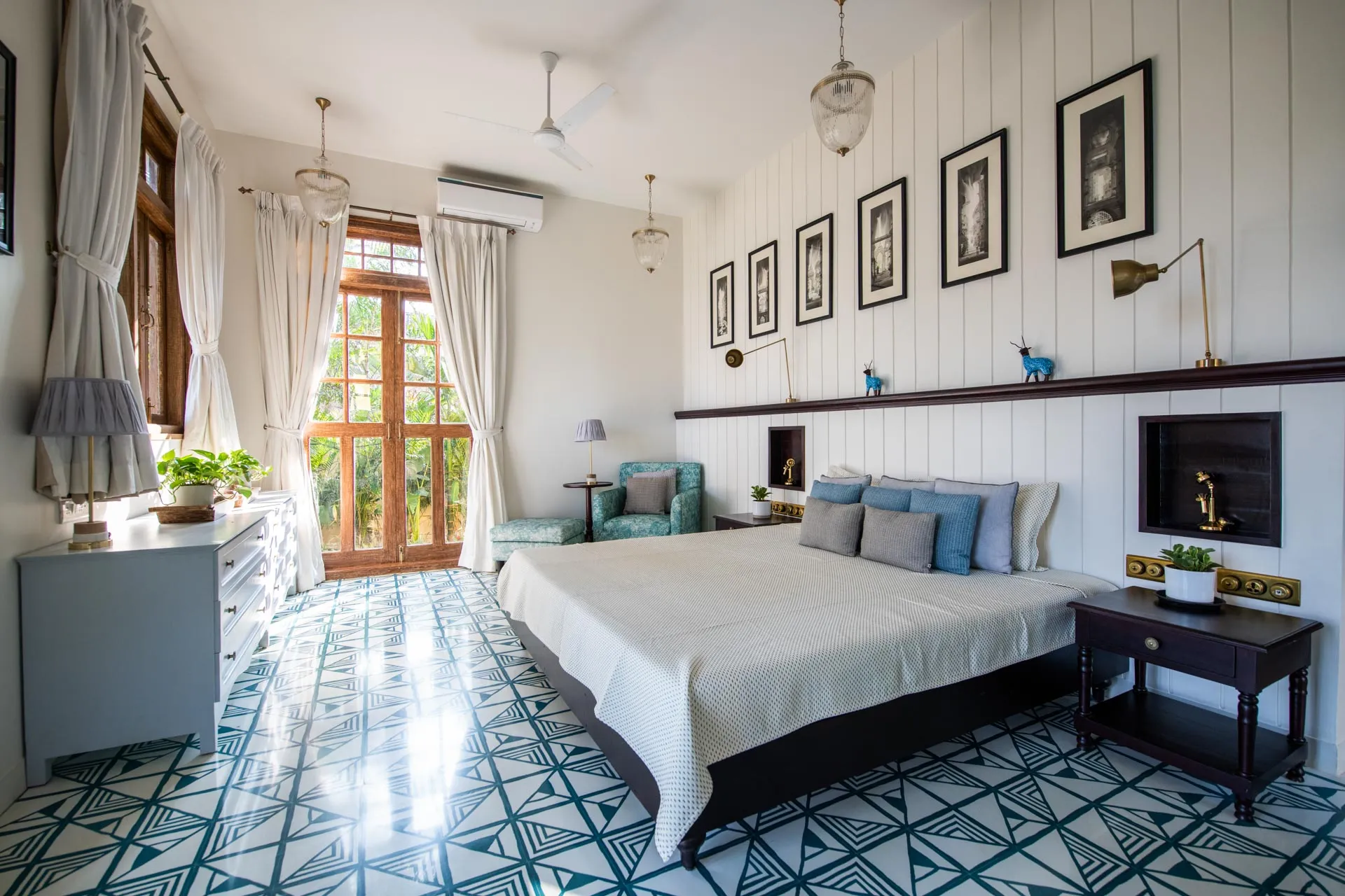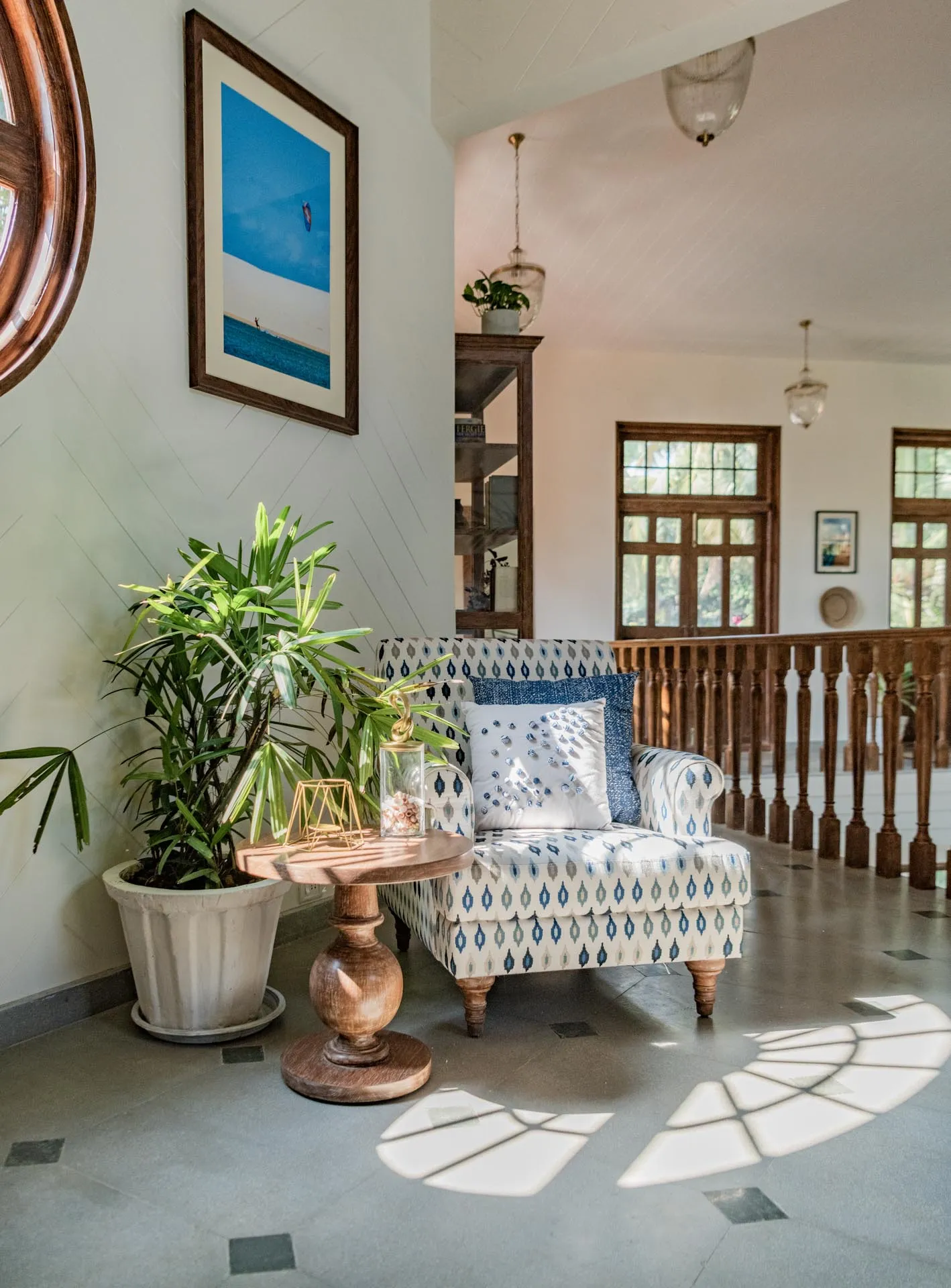 Welcome to lakehouse living in Goa. Estate De Alta Palmeira roughly translates to ‘tall palm trees estate’. Nestled amid swaying palms and overlooking Chapora River, the bright yellow villa is the quintessential spot for a fun-filled holiday. The main building has two levels and houses the living area, dining area, four bedrooms, and a Den. There’s also a two-storied Outhouse, which comprises a spa and one bedroom. The connecting passage contains a powder room and kitchen. Bask in the afternoon sun by the lawns or swim under the palm shadows in the open-air pool. Spend balmy evenings reading in the armchairs overlooking the river. The cosy interiors are a modern take on traditional Goan villas, while the patios are the perfect place to listen to birdsong and rustling leaves. Estate Alta De Palmeira’s thoughtful details, patterned floors and arched walkways are an invitation to slow days and long conversations over wine or a cocktail.