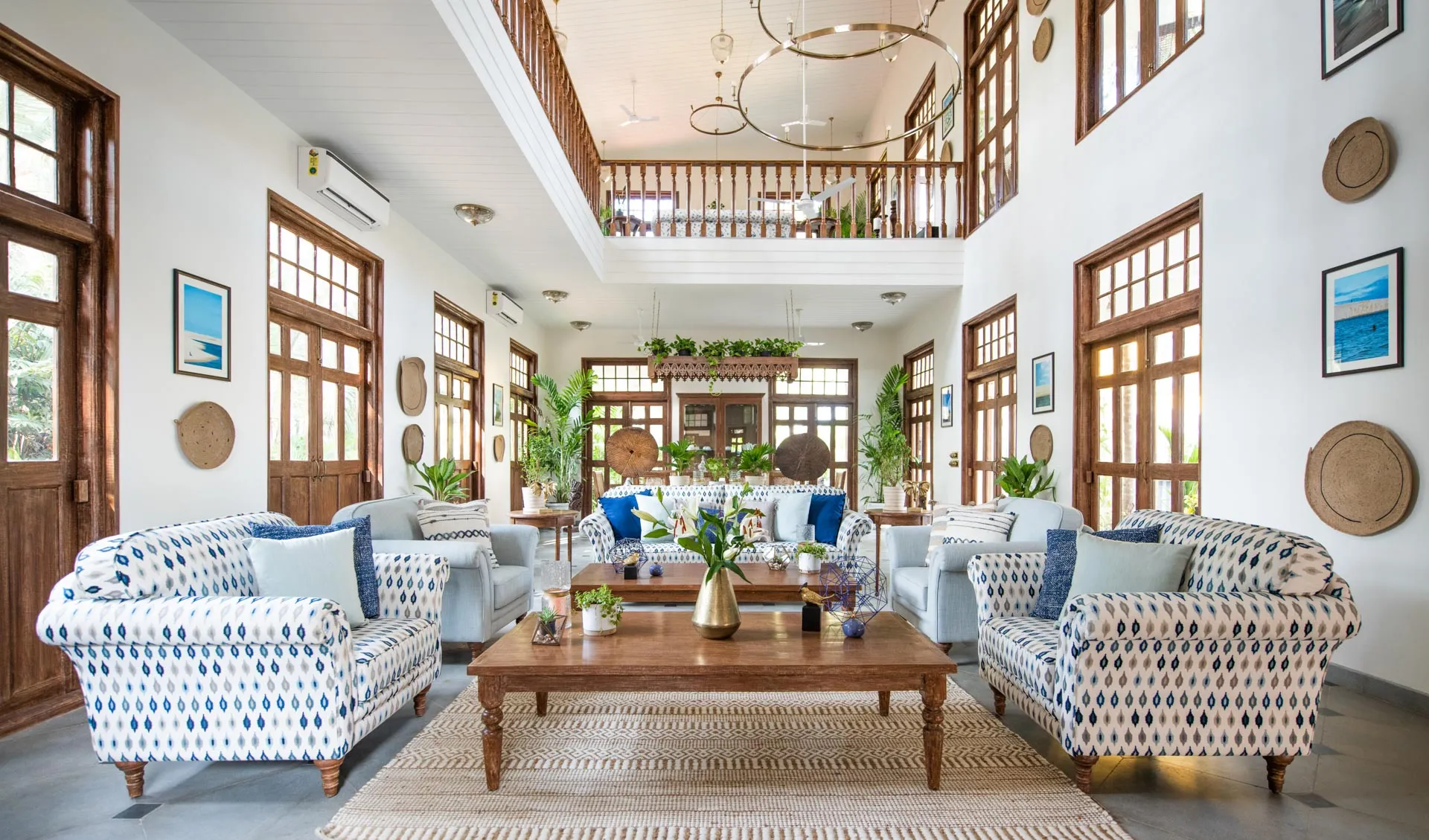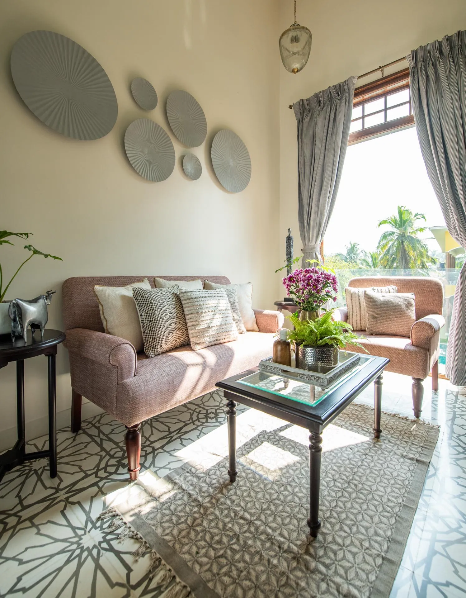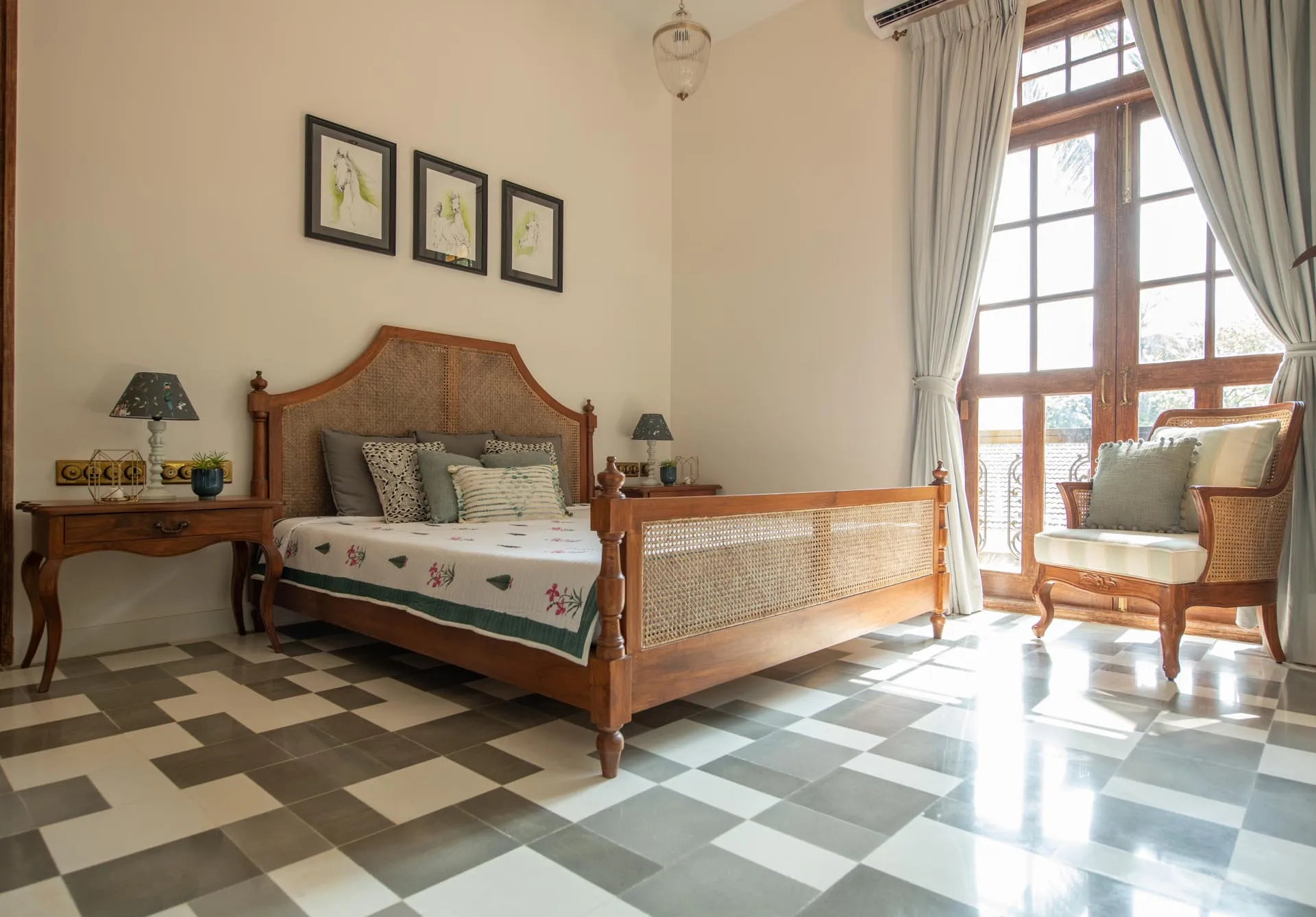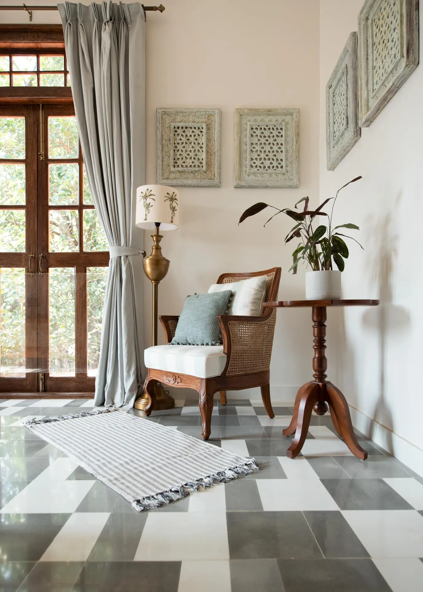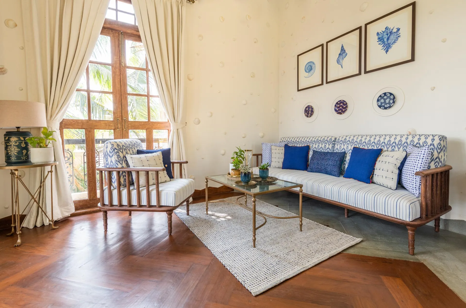 Welcome to lakehouse living in Goa. Estate De Alta Palmeira roughly translates to ‘tall palm trees estate’. Nestled amid swaying palms and overlooking Chapora River, the bright yellow villa is the quintessential spot for a fun-filled holiday. The main building has two levels and houses the living area, dining area, four bedrooms, and a Den. There’s also a two-storied Outhouse, which comprises a spa and one bedroom. The connecting passage contains a powder room and kitchen. Bask in the afternoon sun by the lawns or swim under the palm shadows in the open-air pool. Spend balmy evenings reading in the armchairs overlooking the river. The cosy interiors are a modern take on traditional Goan villas, while the patios are the perfect place to listen to birdsong and rustling leaves. Estate Alta De Palmeira’s thoughtful details, patterned floors and arched walkways are an invitation to slow days and long conversations over wine or a cocktail.