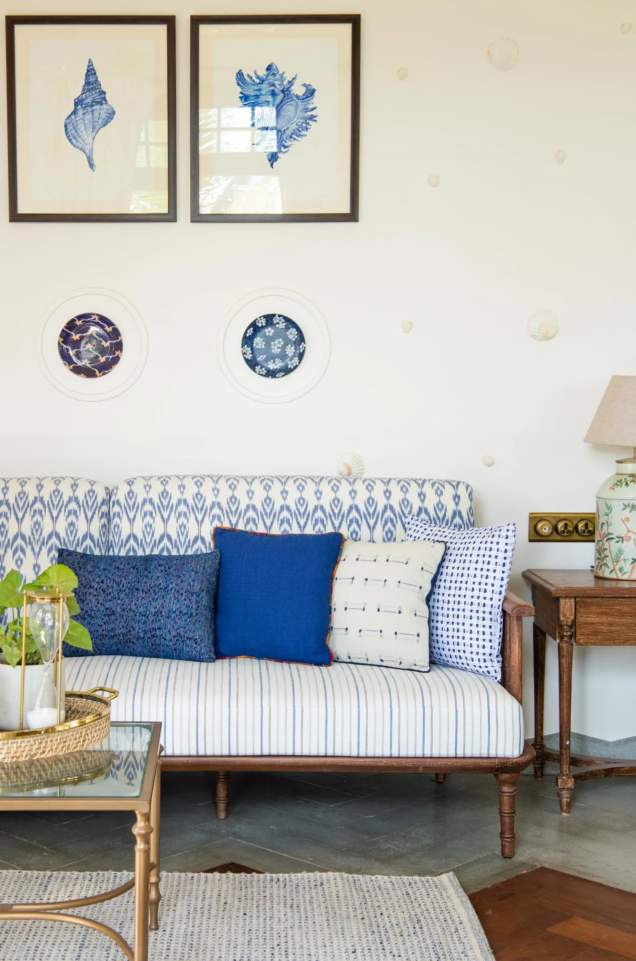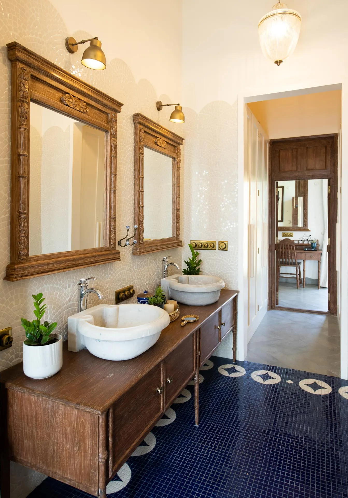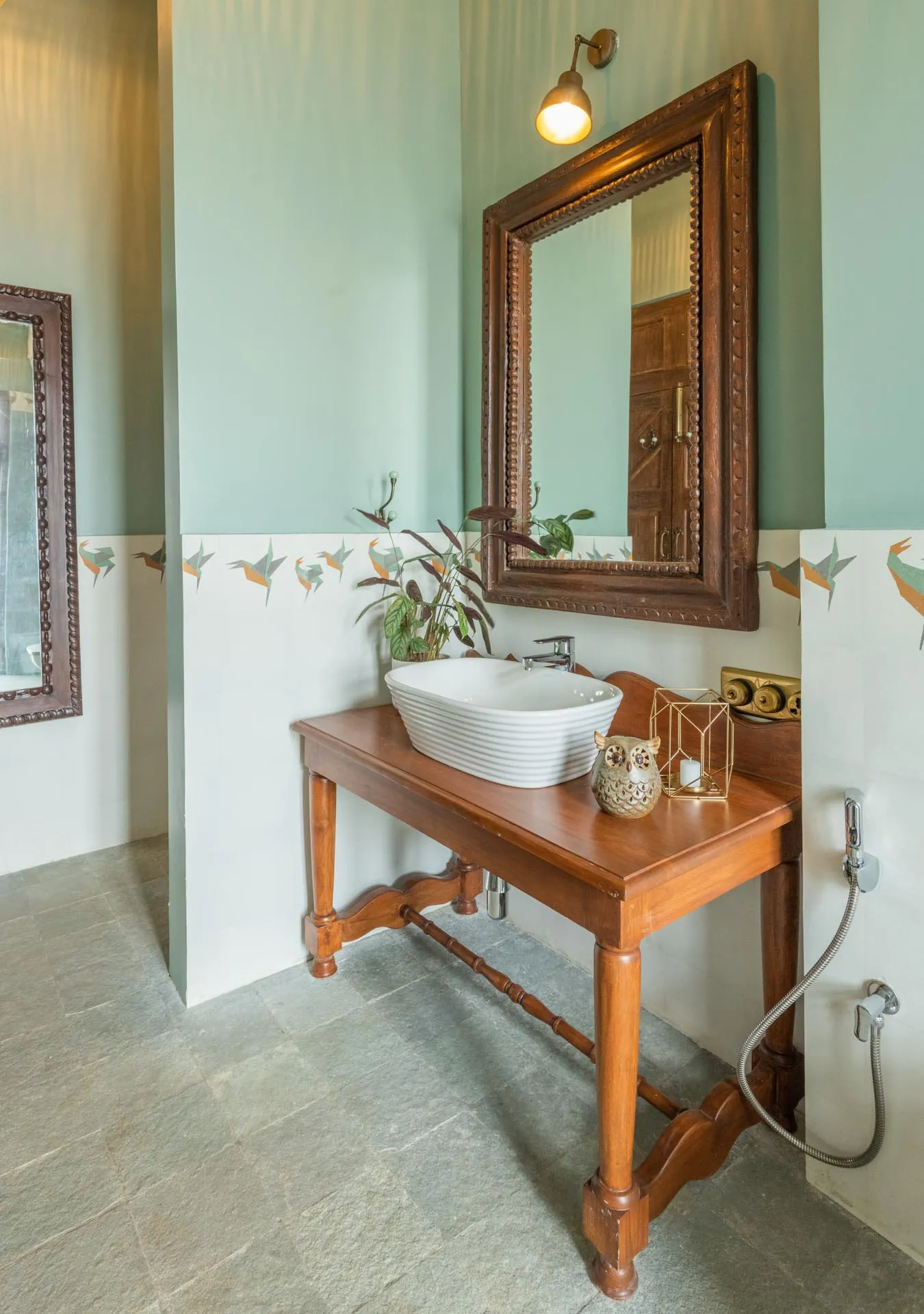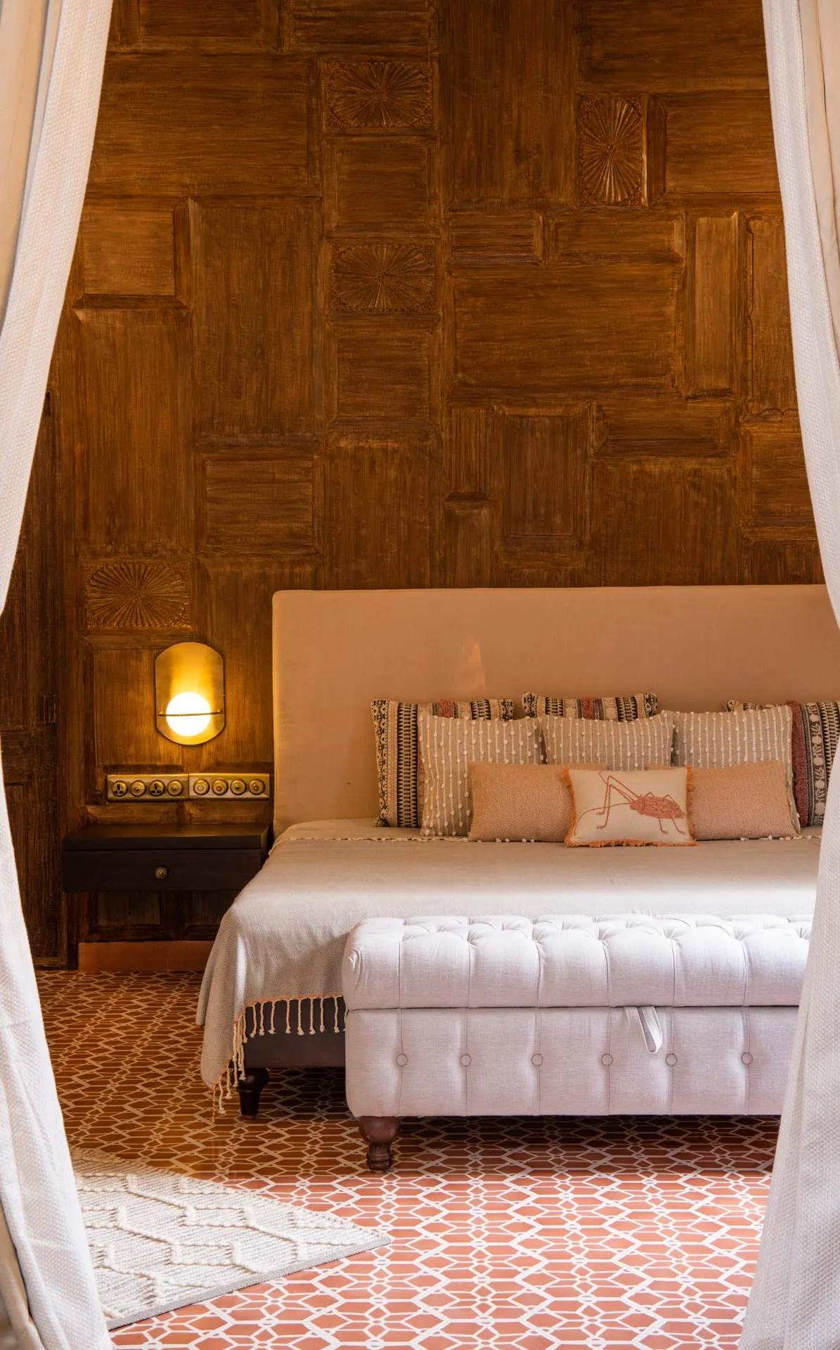 Welcome to lakehouse living in Goa. Estate De Alta Palmeira roughly translates to ‘tall palm trees estate’. Nestled amid swaying palms and overlooking Chapora River, the bright yellow villa is the quintessential spot for a fun-filled holiday. The main building has two levels and houses the living area, dining area, four bedrooms, and a Den. There’s also a two-storied Outhouse, which comprises a spa and one bedroom. The connecting passage contains a powder room and kitchen. Bask in the afternoon sun by the lawns or swim under the palm shadows in the open-air pool. Spend balmy evenings reading in the armchairs overlooking the river. The cosy interiors are a modern take on traditional Goan villas, while the patios are the perfect place to listen to birdsong and rustling leaves. Estate Alta De Palmeira’s thoughtful details, patterned floors and arched walkways are an invitation to slow days and long conversations over wine or a cocktail.