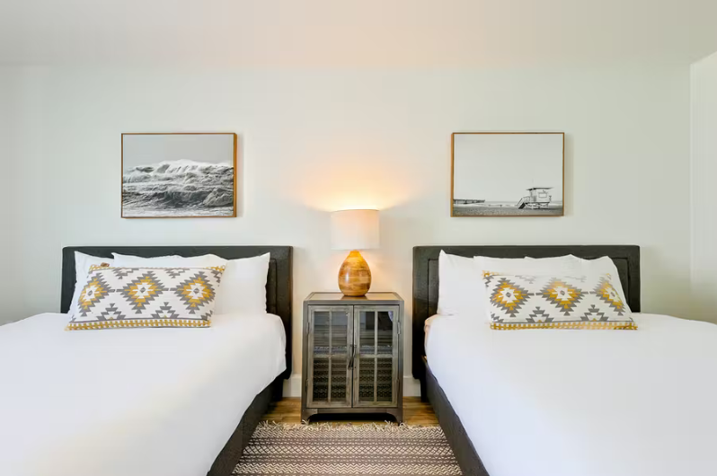 Additional amenities include WIFI and cable, Sonos sound system, parking, fire pit, bikes, surfboards, beach equipment and side by side washer and dryer.