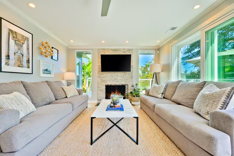 The open concept great room features a large wall-mounted flat screen TV and plenty of seating area to enjoy. Panoramic sliders to the outside back yard let you experience easy inside/outside living to take advantage of the perfect La Jolla climate.