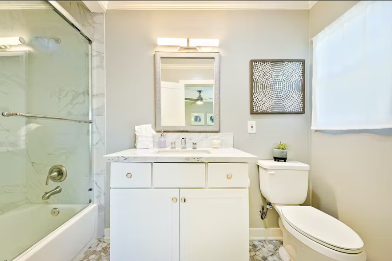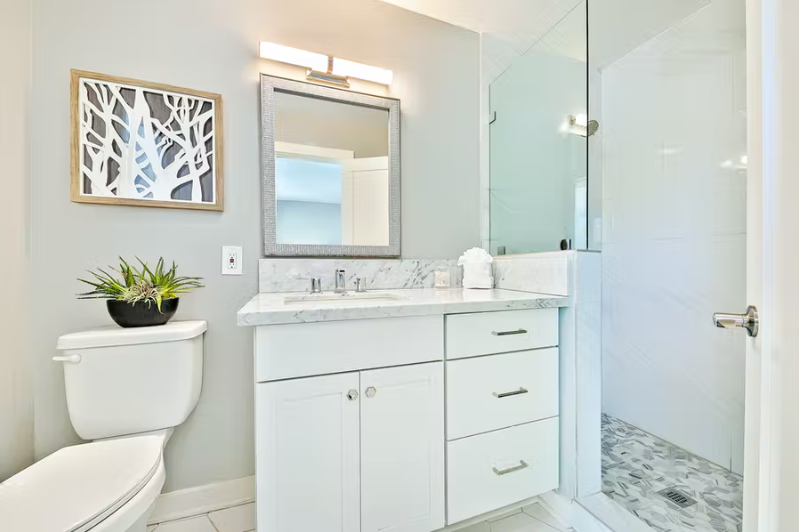Guest Bedroom 1: 1 Queen bed, ensuite bathroom (walk-in shower + vanity sink).