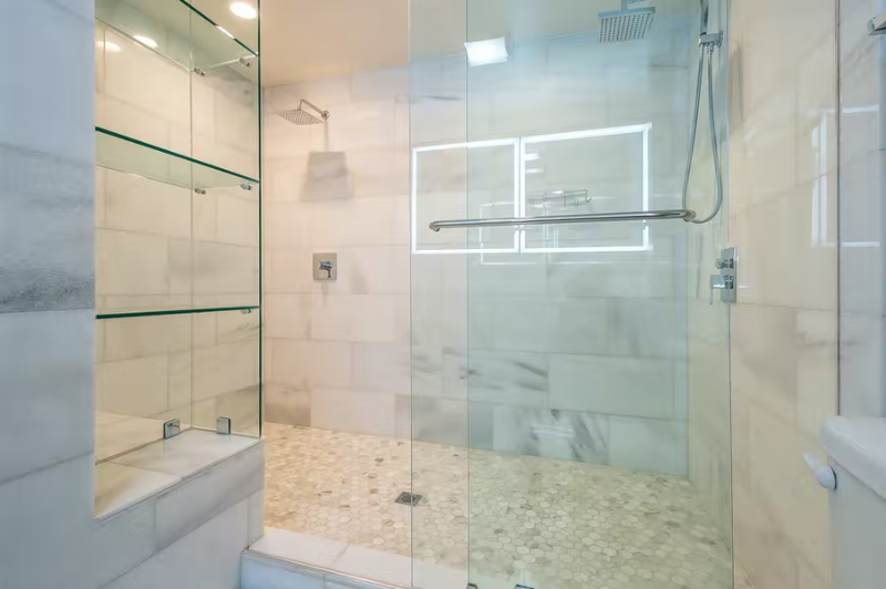Guest Bedroom 2: 1 Queen bed, ensuite bathroom (walk-in shower + vanity sink).