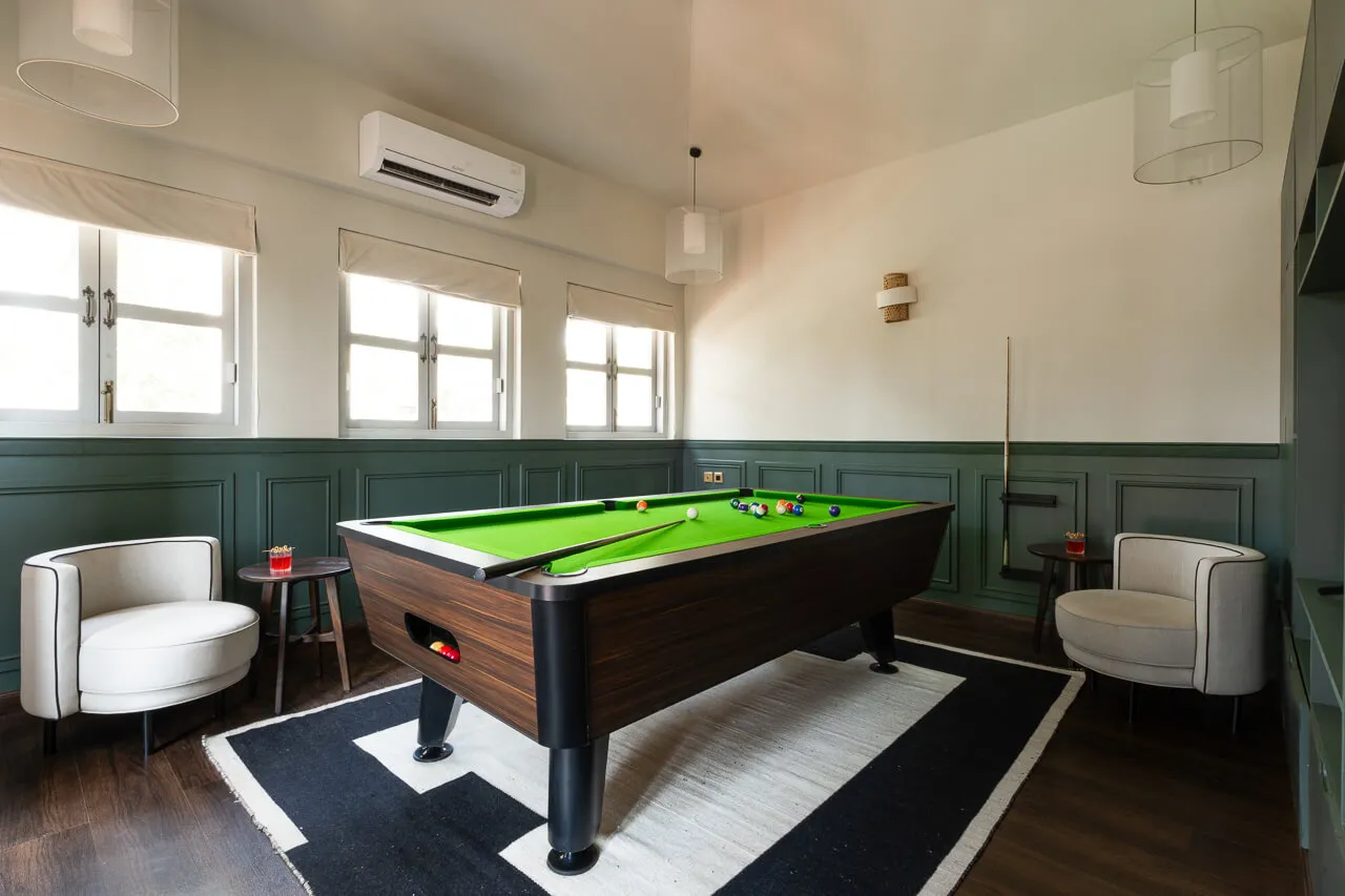 Start your day in tranquility by relaxing on the lush lawn with a morning cup of coffee or practicing yoga amidst the serene surroundings. Spend your afternoons lounging by the massive pool or enjoying a refreshing drink on the open terrace dining and bar. Gather your friends for a friendly game of pool or create lasting memories with a movie night in the dedicated TV room.
