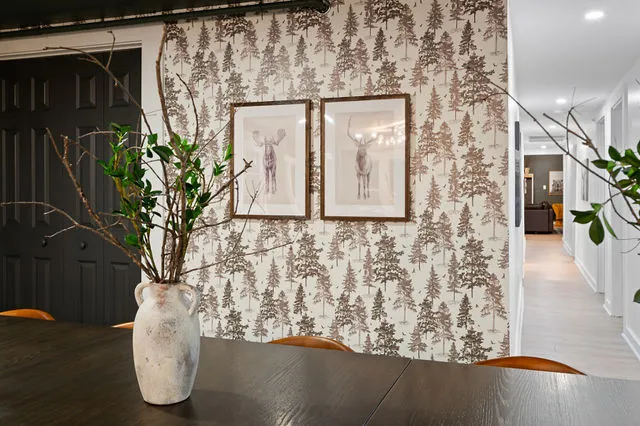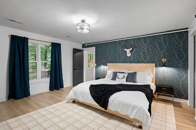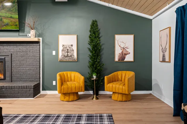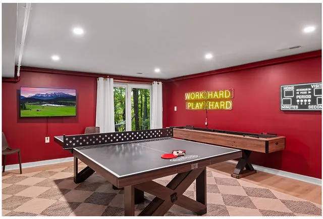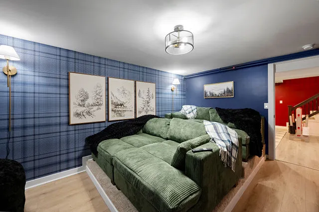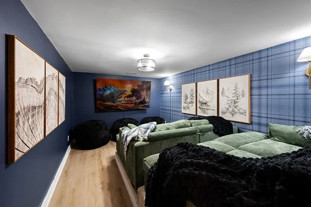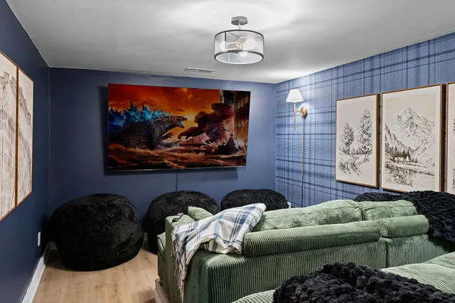 The lower level is your private entertainment hub, featuring a room perfectly suited for a home theater—ideal for cozy movie nights. Throughout the home, brand-new flooring adds a touch of sophistication, while large windows frame the breathtaking natural beauty outside, flooding the space with warm, natural light.