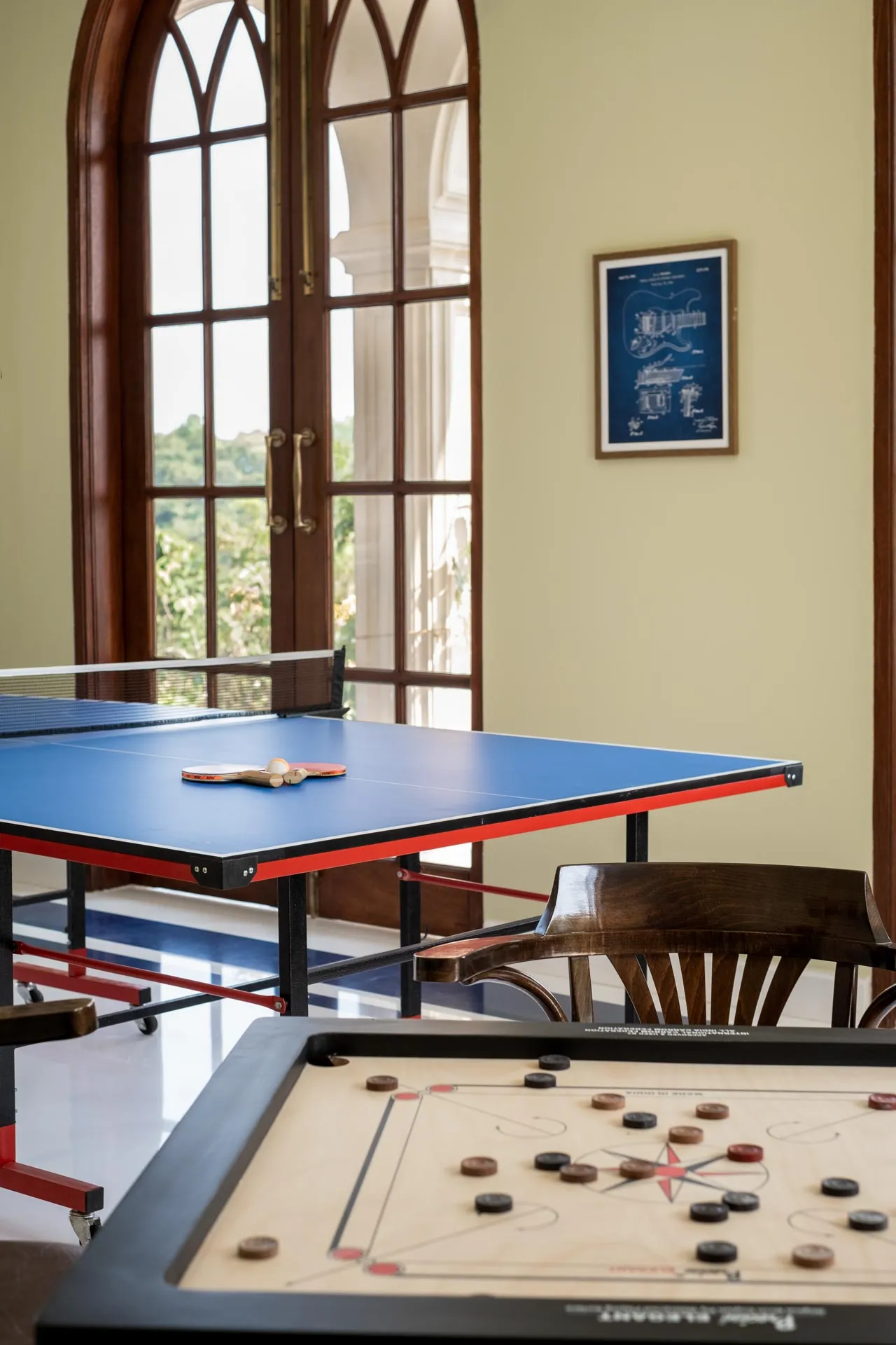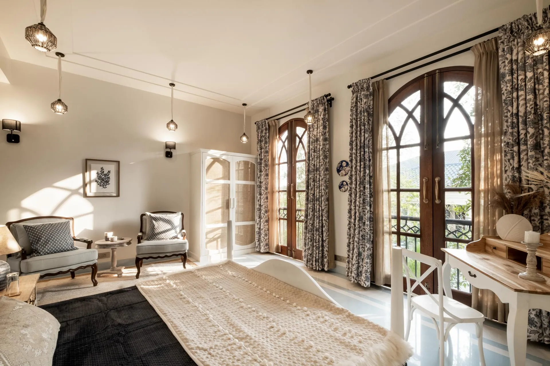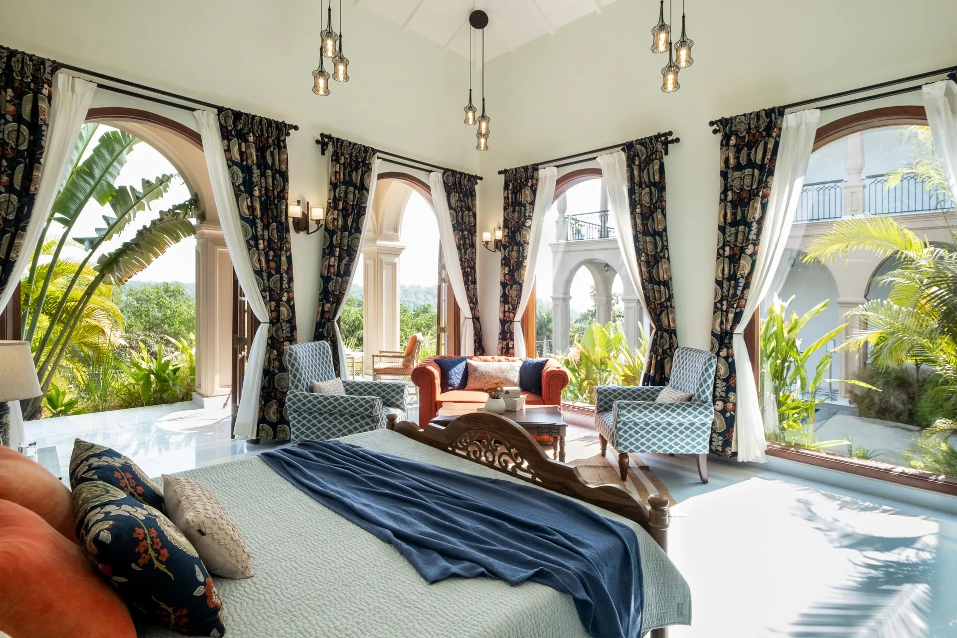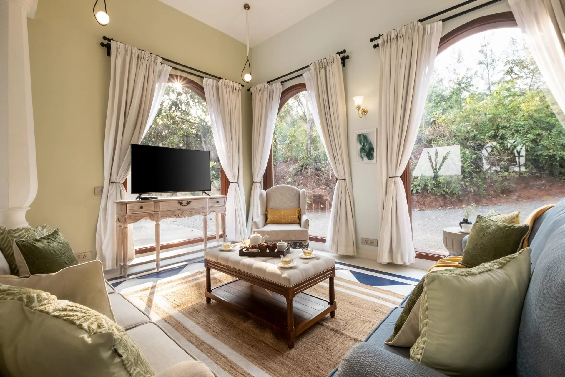 Set atop the hills of Mandrem, Sacri Borod Hill 6 is part of an exclusive villa community in Goa. Boasting majestic Mediterranean architecture and ethereal views of the surrounding vegetation, the villa is an idyllic getaway for large groups. Find a cosy corner in one of the 5 ensuite bedrooms or gather with your friends and family in the elegant living room. Enjoy a playful match in the games room or watch the sunset from one of the balcony sit-outs overlooking the Ashwem sea. Dip in the private pool or take a stroll in the luscious green gardens.