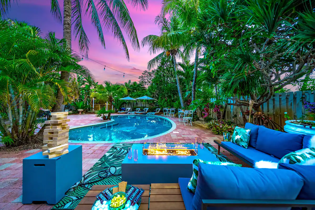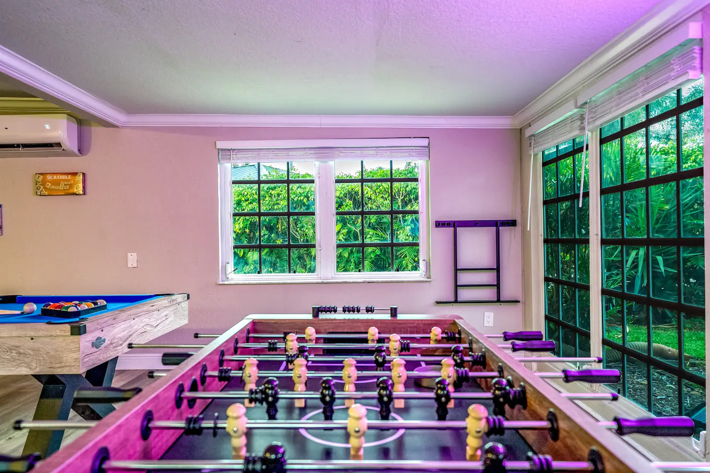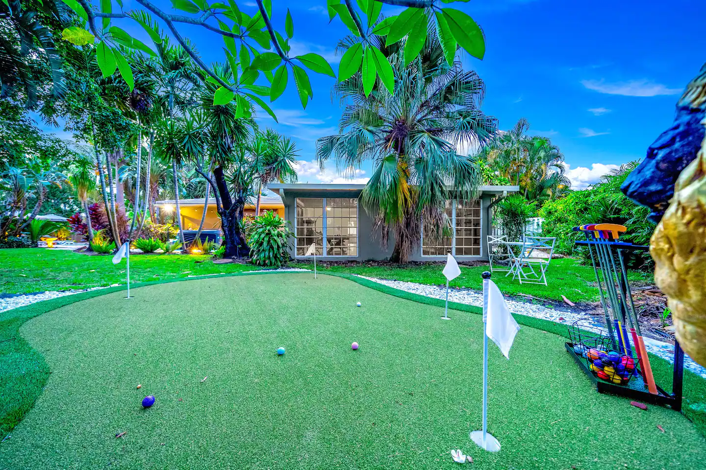 Welcome to your private getaway oasis compound! This huge 5 bed + 3 bath + office large heated pool + hot tub / jacuzzi + 5min to beach + tiki bar with TV + fire pit + free coffee bar + 20 min to airport + billiards + foosball + ping pong + mini golf + bocce + smart TVs in every room + comfy beds + lots of parking + pack n play + beautiful and safe neighborhood. The property is near to coolest neighborhoods in South Florida! So much space for multiple families to have a dream vacation!