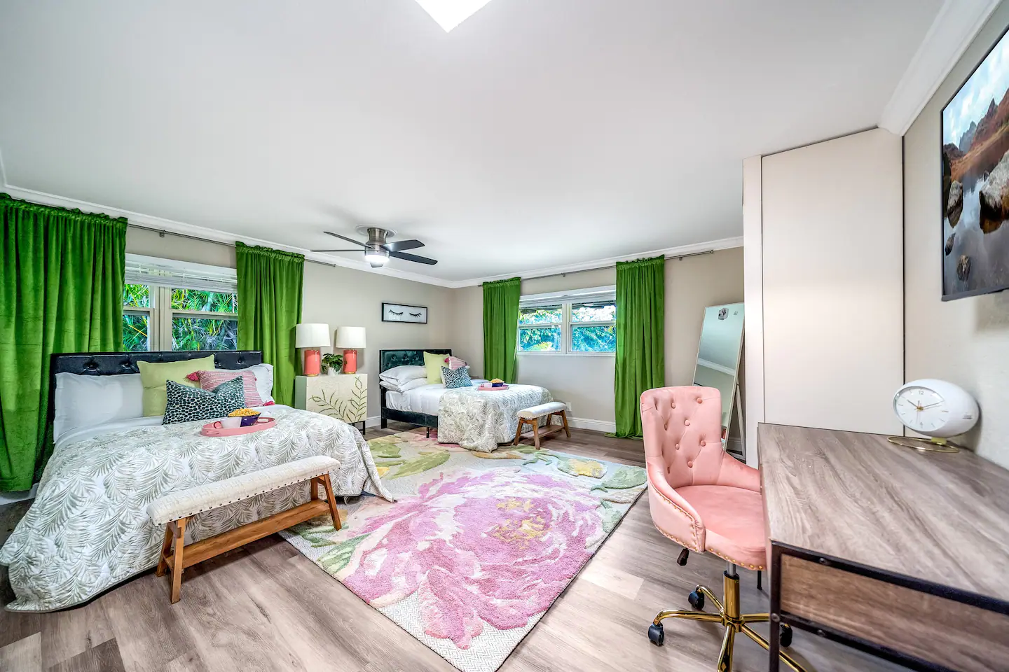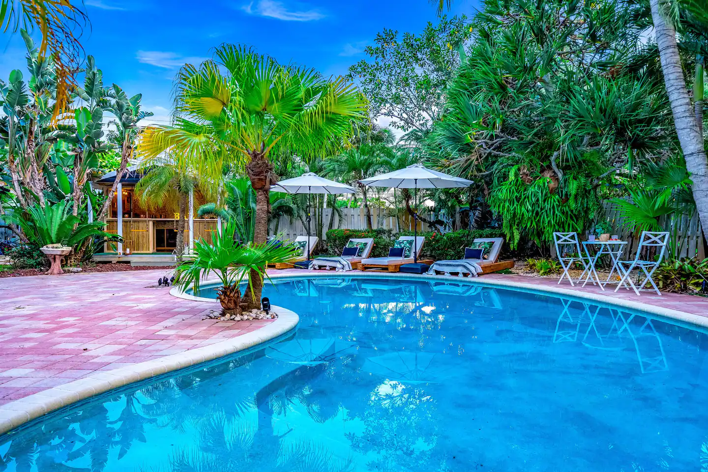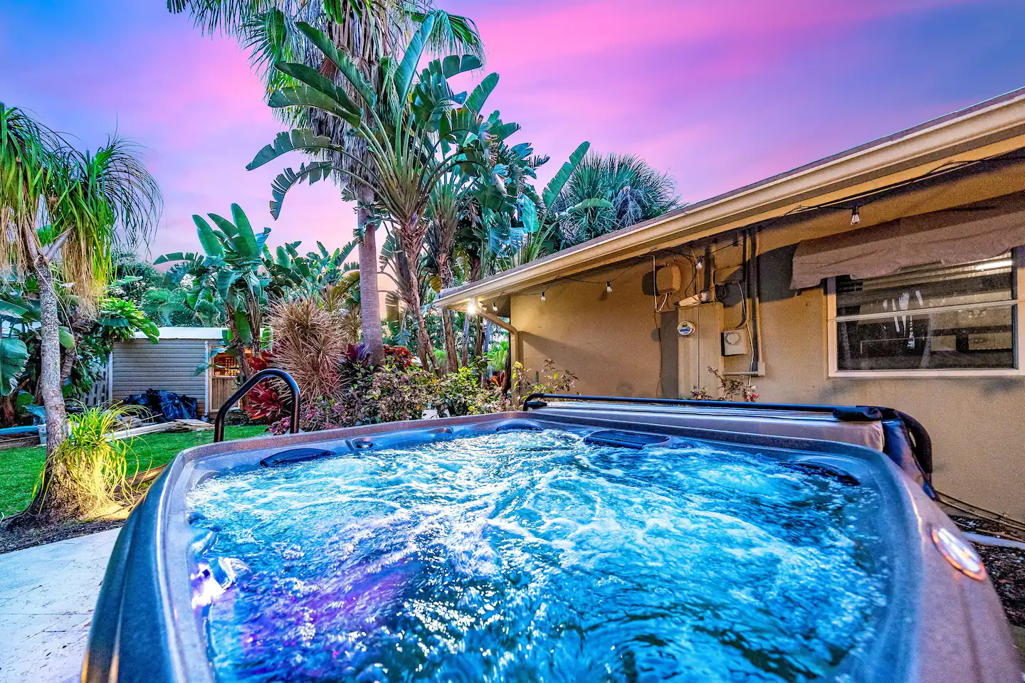 Welcome to your private getaway oasis compound! This huge 5 bed + 3 bath + office large heated pool + hot tub / jacuzzi + 5min to beach + tiki bar with TV + fire pit + free coffee bar + 20 min to airport + billiards + foosball + ping pong + mini golf + bocce + smart TVs in every room + comfy beds + lots of parking + pack n play + beautiful and safe neighborhood. The property is near to coolest neighborhoods in South Florida! So much space for multiple families to have a dream vacation!