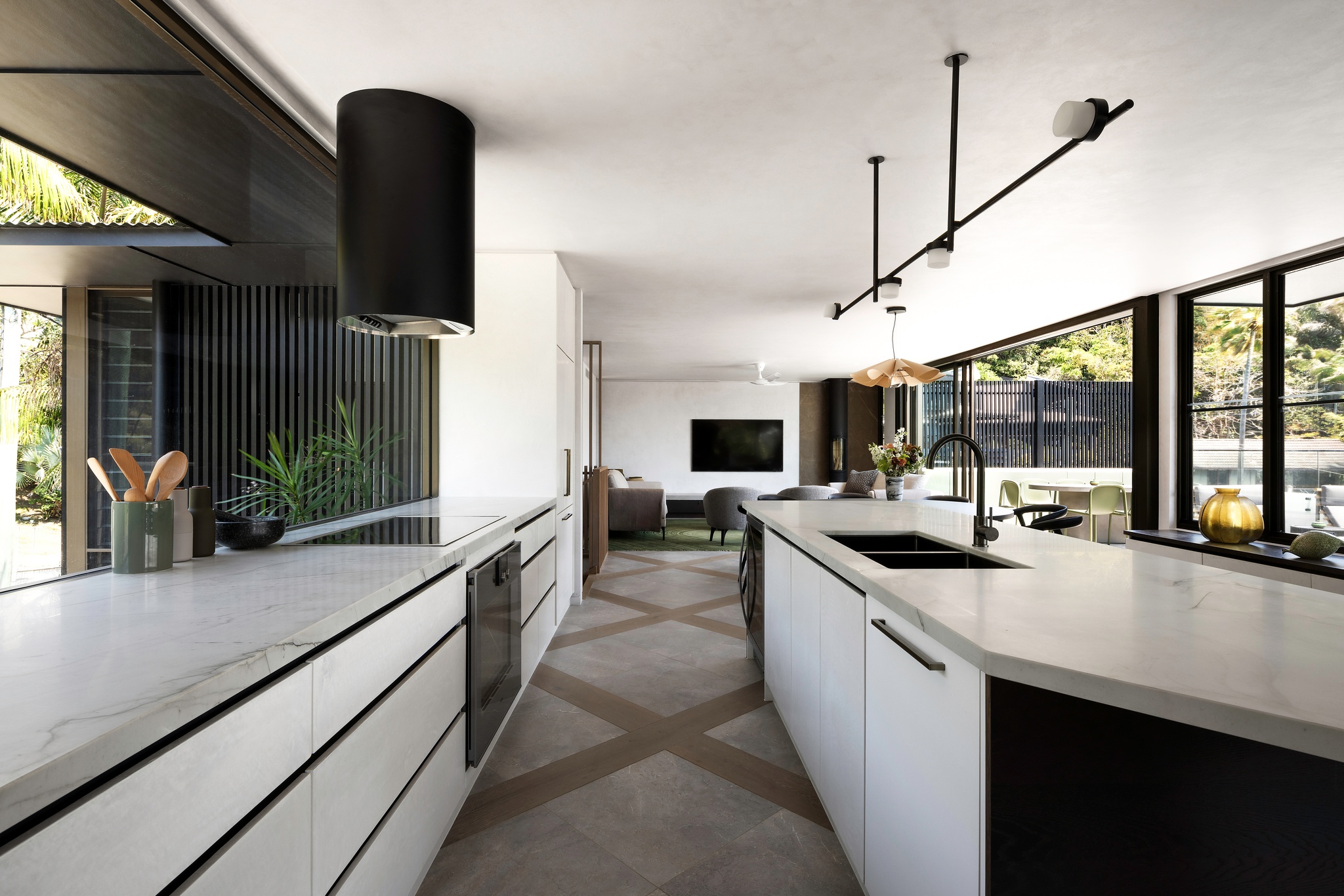 The relaxed luxury synonymous with Wategos, Byron Bay permeates a range of interior spaces. Multiple seating areas invite engagement with fellow guest while four bedrooms provide private, tranquil spaces. Bespoke furniture is featured throughout the house, spotlighting the natural beauty of organic materials. Custom pieces include work by Mark Tuckey, Jardan, Tsar Carpets and others Australian makers, designers and manufacturers. Original art pieces include works by Rikki Kasso, Michael Whiteread, Rebekah Stuart, John Kerry as well as emerging local artist. The palette of tactile, neutral materials features a combination of natural fibers, stone, timber, and hand-finished micro-cement walls to create a soothing backdrop.